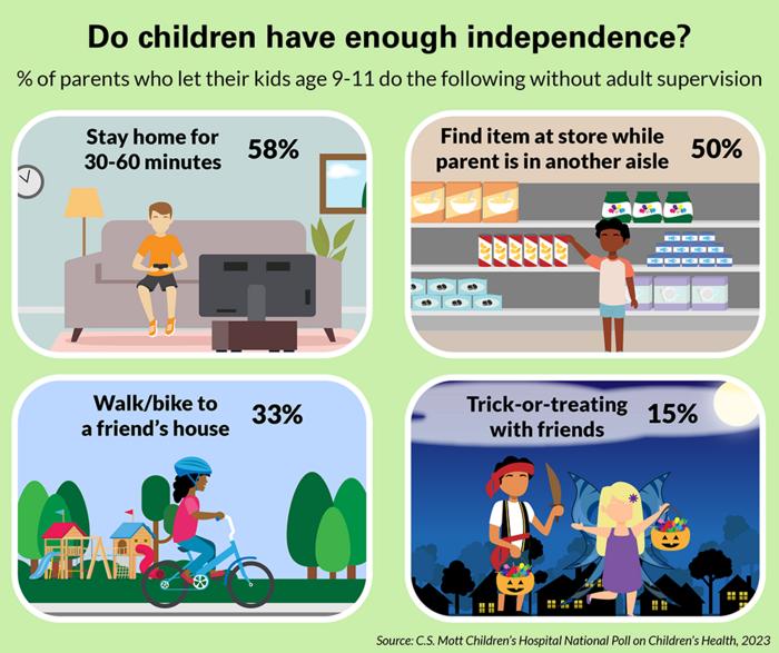 “There’s a sizable gap between parent attitudes about promoting children’s independence and what they actually allow or encourage their children to do without supervision,” said Mott Poll co-director Sarah Clark, M.P.H.