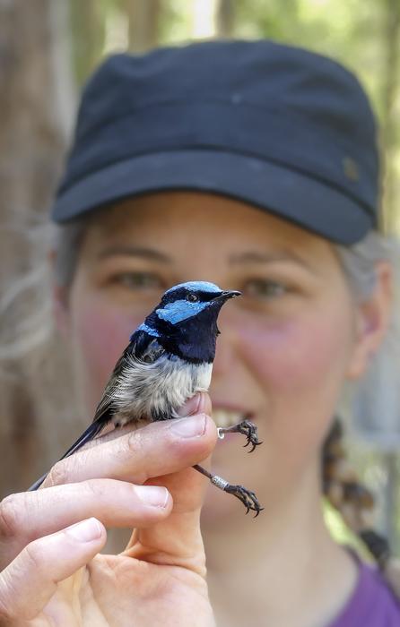 FLINDERS UNIVERSITY ANIMAL BEHAVIOUR LECTURER DR DIANE COLOMBELLI-NÉGREL WITH A MALE SUPERB FAIRYWREN