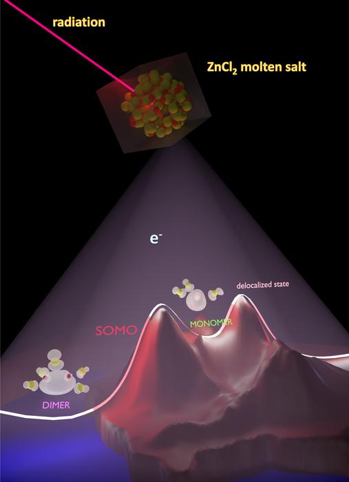 CREDIT: HUNG H. NGUYEN/UNIVERSITY OF IOWAWHEN EXPOSED TO RADIATION, ELECTRONS PRODUCED WITHIN MOLTEN ZINC CHLORIDE, OR ZNCL2, CAN BE OBSERVED IN THREE DISTINCT SINGLY OCCUPIED MOLECULAR ORBITAL STATES, PLUS A MORE DIFFUSE, DELOCALIZED STATE.