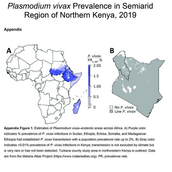 view moreCREDIT: “PLASMODIUM VIVAX PREVALENCE IN SEMIARID REGION OF NORTHERN KENYA, 2019,” WENDY PRUDHOMME-O’MEARA W, LINDA MARAGA, HANNAH MEREDITH, DANIEL ESIMIT, GILCHRIST LOKOEL, TABITHA CHEPKWONY, JOSEPH KIPKOECH, GEORGE AMBANI, DIANA MENYA, ELIZABETH FREEDMAN, STEVE TAYLOR, ANDREW OBALA. EMERGING INFECTIOUS DISEASES, NOV. 2023. DOI: 10.3201/EID2911.230299