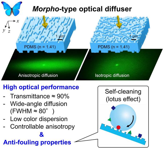 Osaka, Japan – As you watch Morpho butterflies wobble in flight, shimmering in vivid blue color, you’re witnessing an uncommon form of structural color that researchers are only beginning to use in lighting technologies such as optical diffusers. Furthermore, imparting a self-cleaning capability to such diffusers would minimize soiling and staining and maximize practical utility.