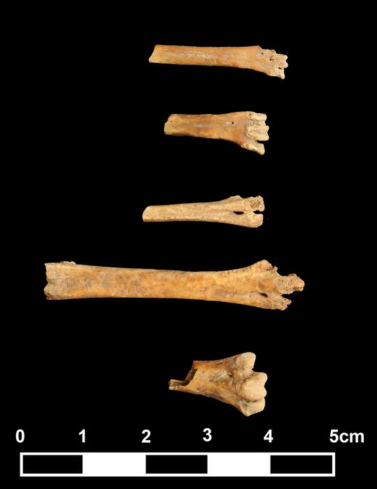 Tarsometatarsi (bone of the lower leg) of birds from the Göbekli Tepe site (from top to bottom): Eurasian jackdaw (Coloeus monedula), hooded crow (Corvus cornix), small duck (Anas crecca/Spatula querquedula), Chukar partridge (Alectoris chukar), medium-sized owl (Asio sp.).