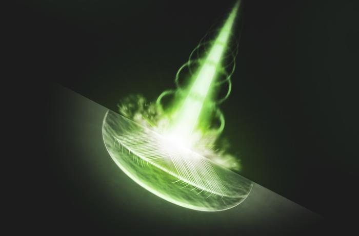 ILLUSTRATION OF AN INTENSE LASER PULSE HITTING A DIAMOND CRYSTAL FROM TOP RIGHT, DRIVING ELASTIC AND PLASTIC WAVES (CURVED LINES) THROUGH THE MATERIAL. THE LASER PULSE CREATES LINEAR DEFECTS, KNOWN AS DISLOCATIONS, AT THE POINTS WHERE IT HITS THE CRYSTAL. THEY PROPAGATE THROUGH THE MATERIAL FASTER THAN THE TRANSVERSE SPEED OF SOUND, LEAVING STACKING FACULTS – THE LINES FANNING OUT FROM THE IMPACT SITE – BEHIND.