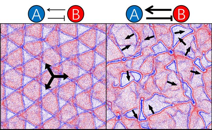 “We modeled the non-reciprocal interaction between two bacterial species”, first author Yu Duan explains. “This means that species A is chasing species B, whereas B is aiming to repel from A”, he continues. The researchers found, that just this chase-and-avoid interaction is sufficient to form a structural pattern. The type of the resulting pattern depends on the strength of the interaction. This complements a previous study, where a model was proposed that also included intraspecies interactions of the bacteria in order to form a pattern.
