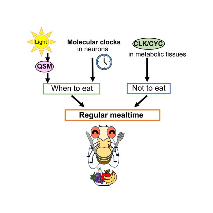 Tokyo, Japan – Researchers from Tokyo Metropolitan University have used fruit flies to study how daily eating patterns are regulated. They found that the quasimodo (qsm) gene helped sync feeding to light/dark cycles, but not in constant darkness: instead, the genes clock (clk) and cycle (cyc) keep eating/fasting cycles, while other “clocks” in nerve cells help sync it to days. Deciphering the molecular mechanism behind eating cycles helps us understand animal behavior, including our own.