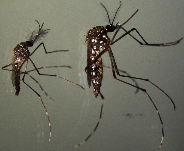 A MALE AND A FEMALE AEDES MOSQUITO, TAKEN IN THE RESEARCHERS’ LAB.