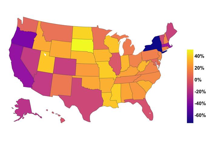 U.S. MAP ILLUSTRATING PERCENTAGE OF INCREASED VIRAL BOOSTS OF COVID-19 PUBLIC HEALTH TWEETS MENTIONING BTS, BY STATE.