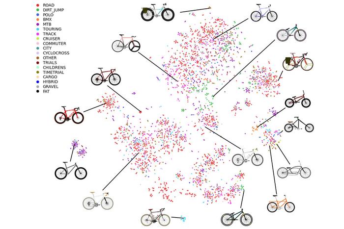 MIT ENGINEERS TRAINED SEVERAL AI MODELS ON THOUSANDS OF BICYCLE FRAMES, SOURCED FROM A DATASET OF FULL BICYCLE DESIGNS, SHOWN HERE COLOR-CODED BY BIKE STYLE.