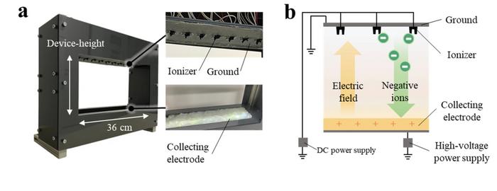 Encouraged by these results, the researchers created a device that generates ions and an electric field (Figure 1). The ozone concentration generated in it was below 0.001 ppm, and the electric field strength at a distance of 30 cm from the device ranged from 10–45 kV, undetectable by humans.