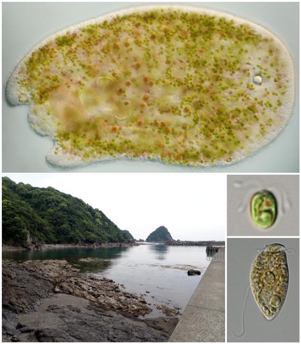 AN ACOEL (TOP) WITH TWO TYPES OF SYMBIONTS COLLECTED IN KOCHI, JAPAN (BOTTOM LEFT). THE GREEN-COLORED SPOTS IN THE ACOEL ARE GREEN ALGAL (TETRASELMIS) SYMBIONTS (MIDDLE RIGHT) AND THE BROWN-COLORED SPOTS ARE DINOFLAGELLATE SYMBIONTS (BOTTOM RIGHT). (PHOTOS: KEVIN WAKEMAN AND SIRATEE RIEWLUANG)