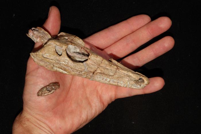 Skulls of two ancient mammal relatives, or synapsids, showing the approximate inferred sizes of the ancestors of two of the major synapsid evolutionary diversifications. Varanosaurus (below), from the Permian Period of Earth history, is about the size of the ancestor of all synapsids. Morganucodon (above), from the Jurassic Period of Earth History about the size of the ancestors of most mammals from the Age of Dinosaurs and modern mammals. Both Varanosaurus and Morganucodon fed on other animals. Photo by Ken Angielczyk.