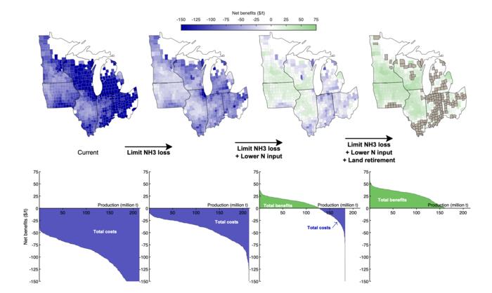 A model examines farmers’ profits and the health and environmental costs of growing corn in the US Midwest, where about 20% of the world’s corn is grown. Corn farming involves applying fertilizer or manure to provide the crop with nitrogen, a vital nutrient. But around half of the nitrogen added to fields never makes it into the crop, and instead enters the environment, either through the air or the water. Andrew L. Goodkind and colleagues set out to model the costs and benefits of corn farming, both under current nitrogen management and alternative approaches. In particular, the authors were interested in capturing the costs associated with air pollution, which have not been as well studied as the costs associated with water pollution. The authors find that the health and environmental costs of current management practices are $25.6 billion per year, far exceeding farmer profits, which averaged $4.3 billion per year from 2013–2022. Emissions in the form of ammonia are responsible for 65% of the costs of nitrogen use. Ammonia forms fine particulate matter that, when inhaled, is associated with a myriad of health conditions. The team then considered several management alternatives, including injecting fertilizer into the ground to reduce air emissions, or reducing fertilizer application rates. Implementing both changes makes corn profits higher than health and environmental costs for the Midwest as a whole, turning net losses into net gains. For some counties, however, costs still outweigh benefits, even after management changes. For these areas, located largely in Indiana, southern Illinois, Ohio, and Michigan, retiring land from corn production may be the best option, according to the authors.
