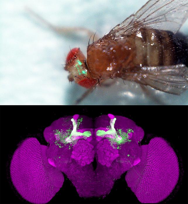 DIFFERENT INTERNAL FEEDING STATES ALTER Α´Β´ MUSHROOM BODY’S (GREEN, UPPER PANEL) NEURONAL ACTIVITIES IN THE BRAIN OF FRUIT FLY, WHICH CONTRIBUTE TO MODERATE AND STRONG HOT AVOIDANCE BEHAVIORS DURING SATIETY AND HUNGER, RESPECTIVELY. THE BOTTOM PANEL SHOWING THE NEUROPIL OF A WHOLE FLY BRAIN (MAGENTA, BRAIN WAS STAINED WITH ANTI-DISCS LARGE ANTIBODY) WHERE THE Α´Β´ MUSHROOM BODY NEURONS ARE GENETICALLY LABELED WITH GREEN FLUORESCENT PROTEIN (GREEN).