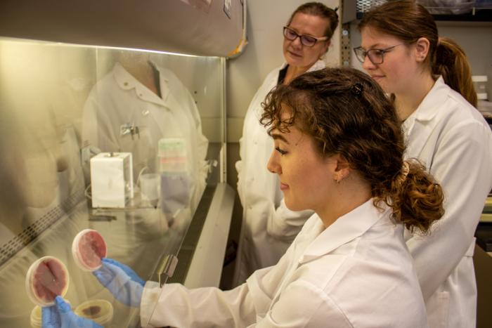 Caption: Lola McMullan (in foreground), a graduate student and Carver Fellow; Hope Gruszewski (at back left), laboratory specialist senior; and Shae Forwood, a senior, work with fungi and plant tissue cultures in the Schmale lab. Photo by Felicia Spencer for Virginia Tech.