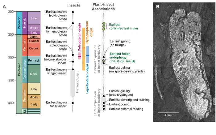 (A) Major fossil evidence for insects and plant-insect associations are presented with labeled points, with special reference to holometabolous insect orders (Diptera, Hymenoptera, Lepidoptera and Coleoptera) and foliar endophytic damage. Genomic estimates of the origin of the major leaf mining orders are given in pink (Coleoptera), orange (Hymenoptera) and blue (Lepidoptera). (B) Fossil pinnule mines on Macroneuropteris scheuchzeri. (MCZ 198877a) from the Rhode Island Formation in Massachusetts, U.S.A.