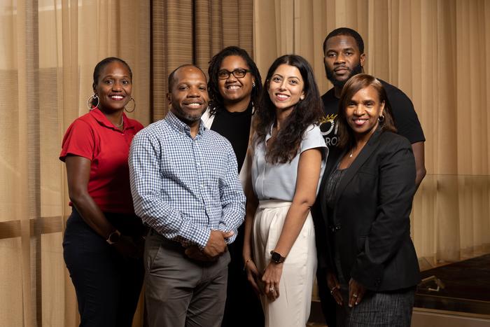 BACK ROW (LEFT TO RIGHT): DR. APRIL PETERS HAWKINS, PROFESSOR, COLLEGE OF EDUCATION; DR. JACQUELINE EKEOBA, CLINICAL ASSISTANT PROFESSOR, COLLEGE OF NATURAL SCIENCE & MATHEMATICS; MARVIN PIERRE, EXECUTIVE DIRECTOR, 8 MILLION STORIES