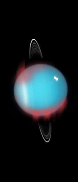 AN ARTISTIC REPRESENTATION OF HOW THE NORTHERN INFRARED AURORA WOULD HAVE LOOKED LIKE IN 2006 (MARKED IN RED). THE DARKER RED LOCATIONS INDICATE CONFIRMED AURORA LOCATIONS, WITH FAINTER RED USED TO MARK POSSIBLE AURORA LOCATIONS. CREDIT TO NASA, ESA AND M. SHOWALTER (SETI INSTITUTE) FOR THE BACKGROUND IMAGE OF URANUS, AS WAS OBSERVED BY THE HUBBLE SPACE TELESCOPE (IN THE VISIBLE SPECTRUM) IN AUGUST 2005.