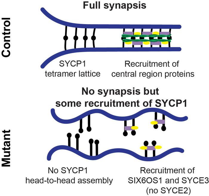 Model of the synaptonemal complex in control and mutant mice. The protein the team investigated (SYCP1) forms normally, and all additional necessary proteins are recruited. In the mutant, SYCP1 localizes to the chromosome axes but does not successfully form the bridge-like structure (head-to-head interactions), and the additional proteins that help keep the bridge intact are either missing or not properly organized.