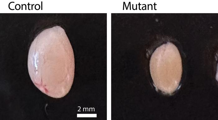 Representative testes from 9-week-old control mice (left) and mice with a point mutation in one synaptonemal complex protein (right).
