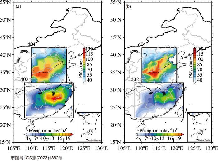 DISTRIBUTION OF TIME-AVERAGED PM2.5 CONCENTRATION (UNIT: ΜG M−3) OVER THE NORTH CHINA PLAIN (32°N−42°N, 110°E−120°E) AND RAINFALL (UNIT: MM DAY−1) IN SOUTHERN CHINA (22°N−32°N, 108°E−122°E) FROM 3 TO 12 FEBRUARY 2023. (A) OBSERVED PM2.5 CONCENTRATION AND GPCC RAINFALL; (B) TAP PM2.5 CONCENTRATION AND CPC RAINFALL. D01 AND D02 REPRESENT THE NORTH CHINA PLAIN AND SOUTHERN CHINA, RESPECTIVELY.