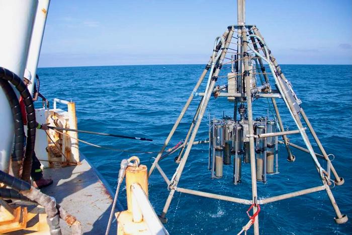 THIS SHOWS THE MULTICORER BEING RECOVERED. THE SEDIMENT IN THE TUBES IS APPROXIMATELY HOW MUCH HAS ACCUMULATED IN THE PAST 1,000 YEARS.