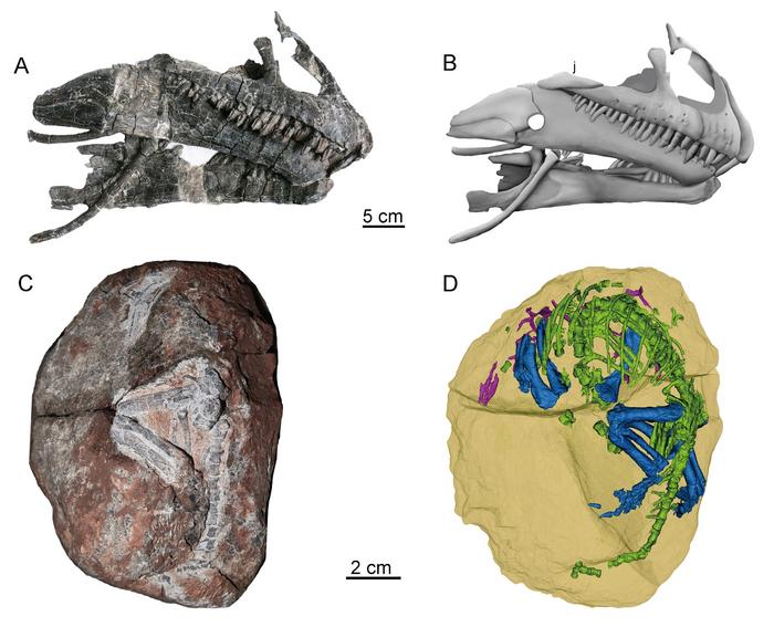 PHOTOGRAPH (A) AND LINE DRAWING (B) OF THE SKULL IN RIGHT LATERAL VIEW. A WELL-PRESERVED EMBRYO (C) AND ITS 3D (D) RECONSTRUCTION SHOWING THE PREHATCHING POSTURE.