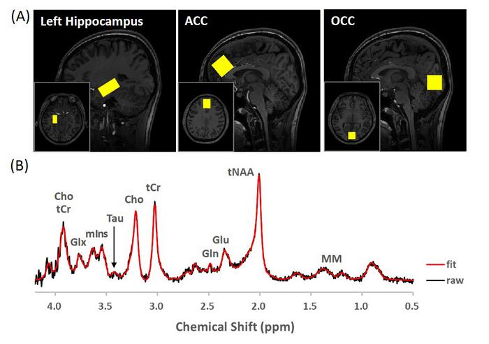 (A) BRAIN REGIONS WHERE SPECTRA WERE MEASURED (YELLOW BOX) (B) 1H MR SPECTRUM IN THE HIPPOCAMPUS: HIPPOCAMPAL TAURINE SIGNAL SHOWN AT 3.4 PPM (ARROW). BLACK LINE: ACTUAL MEASURED SPECTRUM. RED LINE: LCMODEL FITTING SPECTRUM.