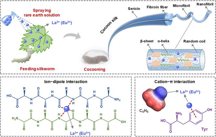 ON THE ABOVE, THE RARE EARTH SOLUTION WAS SPRAYED ON MULBERRY, WHICH WAS FED TO SILKWORM TO SPUN REINFORCED SILK FIBERS. ON THE BELOW, IT ILLUSTRATES THE ION−DIPOLE AND CATION−Π INTERACTION BETWEEN RARE EARTH IONS AND SILK.