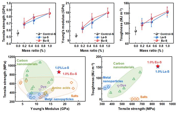 On the above, the strength, modulus, and toughness increased with the mass ration of rare earth ions. On the below, the comprehensive mechanical performance of rare earth ion-modified silk is superior to that of silk modified by other functional materials.