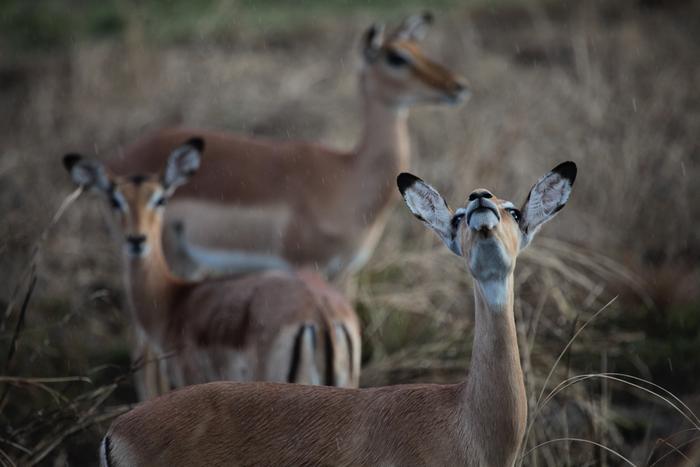 HEAVY RAINS FALL ON THREE IMPALA IN GORONGOSA NATIONAL PARK IN CENTRAL MOZAMBIQUE. WHEN CYCLONE IDAI SLAMMED GORONGOSA WITH 105 MPH WINDS AND POUNDING RAINS ON MARCH 15, 2019, THE RESULTING FLOODWATERS TRANSFORMED THE ECOSYSTEM OF THE PARK, KILLING HALF OF THE ORIBI AND REEDBUCK (TWO SMALL ANTELOPE SPECIES) AND DAMAGING MANY OTHER HERBIVORE POPULATIONS. SOME DIED DURING THE STORM, UNABLE TO OUTRUN THE RISING WATERS, AND OTHERS DIED OF STARVATION OR MALNUTRITION IN THE AFTERMATH, AS NUTRIENT-DENSE GRASSES DROWNED, LEAVING ANIMALS TO FORAGE ON NUTRIENT-POOR SUBSTITUTES.