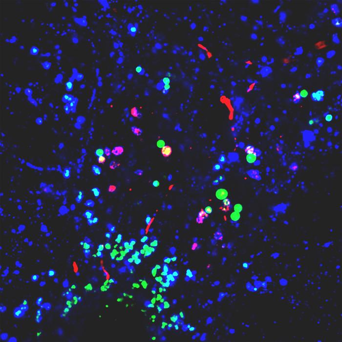 PLASTIC NANOPARTICLES (GREEN), VISIBLE UNDER A MICROSCOPE, CO-MINGLING WITH PROTEIN AGGREGATES(RED) IN NEURONAL LYSOSOMES (BLUE). TYPICALLY, CONCENTRATIONS OF THE PROTEIN AGGREGATES ARE SO SMALL, THEY WOULD NOT BE VIABLE AT THIS LEVEL.