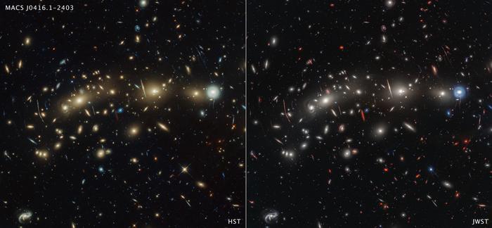This side-by-side comparison of galaxy cluster MACS0416 as seen by the Hubble Space Telescope in optical light (left) and the James Webb Space Telescope in infrared light (right) reveals different details. Both images feature hundreds of galaxies, however the Webb image shows galaxies that are invisible or only barely visible in the Hubble image. This is because Webb’s infrared vision can detect galaxies too distant or dusty for Hubble to see. (Light from distant galaxies is redshifted due to the expansion of the universe.) The total exposure time for Webb was about 22 hours, compared to 122 hours of exposure time for the Hubble image.