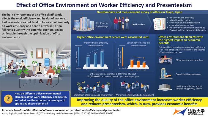 In a new study published on 1 September 2023, in Volume 243 of the journal Building and Environment, researchers from Japan investigated how office environmental elements impact work efficiency and worker health, while also analyzing the economic benefits of optimizing these elements. They surveyed 1644 workers in 29 office buildings in Tokyo, collecting data on the built environment through worker questionnaires and physical IEQ measurements. They then compared the perceived work efficiency (reported by workers) in offices to that in an 'ideal' office with maximum work efficiency to estimate the economic value provided by the built environment. Similarly, they looked at the extent of presenteeism (working while sick) and compared it to a scenario where workers faced no health-related barriers to work. The study, led by Professor Shun Kawakubo from the Faculty of Engineering and Design at Hosei University, Japan, included colleagues Shiro Arata and Masaki Sugiuchi from Hosei University, and others.