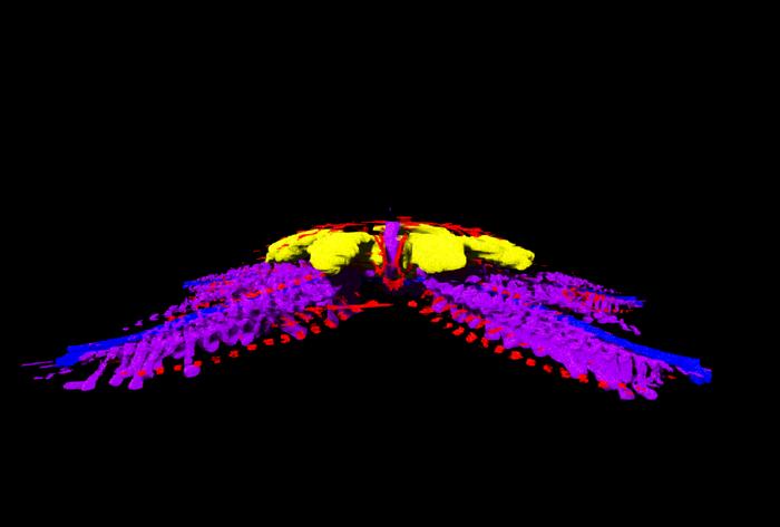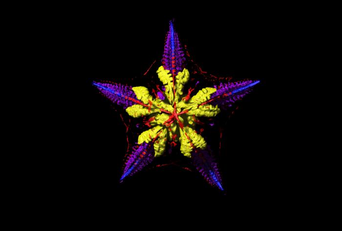 MICRO-CT SCAN OF SEA STAR SHOWING THE SKELETON (GREY), DIGESTIVE SYSTEM (YELLOW), NERVOUS SYSTEM (BLUE), MUSCLES (RED) AND WATER VASCULAR SYSTEM (PURPLE).