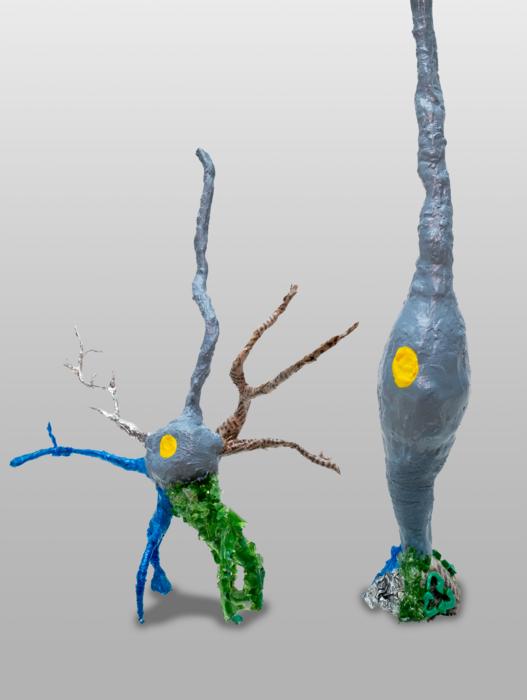 TWO SCULPTURES REPRESENTING A HUMAN NEURON AND A RADIAL GLIA CELL, INSPIRED BY THE FINDINGS PUBLISHED BY THE QUADRATO LAB IN NATURE NEUROSCIENCE.