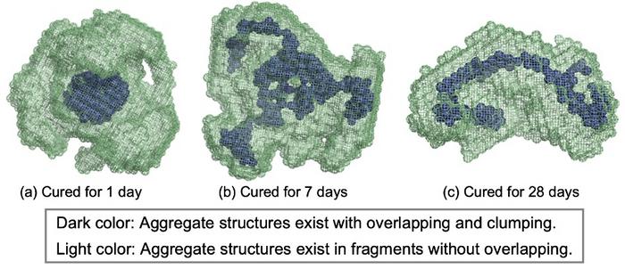 DESPITE THE USE OF CHEMICAL TREATMENT FOR STRNEGTHENING SANDY SOILS, AN UNDERSTANDING OF HOW IT GAINS STRENGTH IS LACKING. NOW, SCIENTISTS HAVE STUDIED HOW SANDY SOIL IS MADE STRONGER THROUGH THE INJECTION OF CHEMICALS. THE IMAGE ABOVE SHOWS THE DYNAMIC CHANGES IN THE MOLECULAR STRUCTURE OF HYDROGELS OVER TIME, AS REVEALED THROUGH THEORETICAL MODELING.