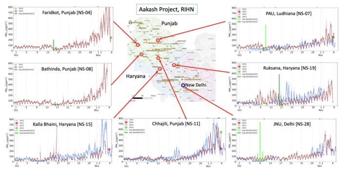In 2022, a group of international collaborators led by the Research Institute for Humanity and Nature (RIHN) team have conducted field campaign in the region of Punjab, Haryana and Delhi NCR (Singh et al., 2023; RIHN press release on 2nd Oct 2023). A network of about 30 low-cost Compact and Useful PM2.5 Instrument with Gas sensors (CUPI-Gs) has been established in the region for this year as well (Figure 1). These measurements, for the first time, provided a wholesome picture of month-long CRB activities in the source regions and their contribution to the limited number of high PM2.5 events over the Delhi NCR. In the air pollution events that occurred in Delhi last November, the impact of CRB was found to be severe. Our analysis also suggested its predictive capability by using the data from the whole CUPI-G measurements (Singh et al., 2023; unpublished analysis).