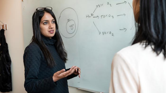 GLADSTONE ASSISTANT INVESTIGATOR Isha Jain, PhD, SENIOR AUTHOR OF THE NEW STUDY, DISCUSSES THE RESEARCH WITH FIRST AUTHOR KIRSTEN XUEWEN CHEN. THEIR FINDINGS EXPLAIN HOW BREATHING AIR WITH DIFFERENT LEVELS OF OXYGEN AFFECTS THE CREATION AND DEGRADATION OF DIFFERENT PROTEINS IN THE LUNGS, HEART, AND BRAIN OF MICE.