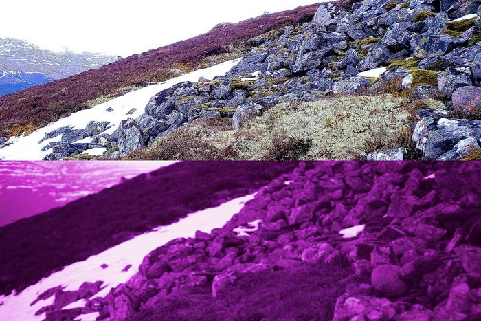 To the human eye, the white lichen is invisible against the snowy backdrop of an Arctic winter.