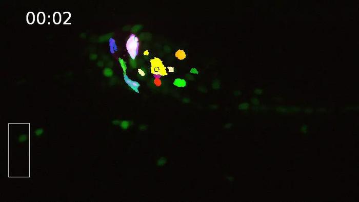 TWO-DIMENSIONAL PROJECTION OF 3D VOLUMETRIC BRAIN ACTIVITY RECORDINGS IN C. ELEGANS. GREEN: GENETICALLY ENCODED CALCIUM INDICATOR, VARIOUS COLORS: SEGMENTED AND TRACKED NEURONS.