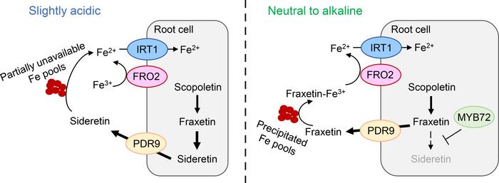 "Our study shows that by adjusting coumarin biosynthesis, plants recruit specific functions depending on the prevailing pH of the soil," says Dr. Ricardo Giehl. If the conditions are slightly acidic, plants favor the synthesis of the superior Fe3+ reductant sideretin, while at high pH they direct synthesis towards fraxetin, which retains high Fe3+ mobilization capacity even under alkaline conditions.