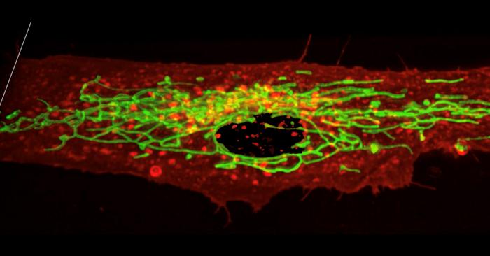 IN MOST CELLS, MITOCHONDRIA (GREEN) FORM COMPLEX TUBULAR NETWORKS THAT HELP THEM DISTRIBUTE ENERGY THROUGHOUT THE CELL. DISRUPTION OF THESE MITOCHONDRIAL NETWORKS IS A HALLMARK OF MANY HUMAN DISEASES.