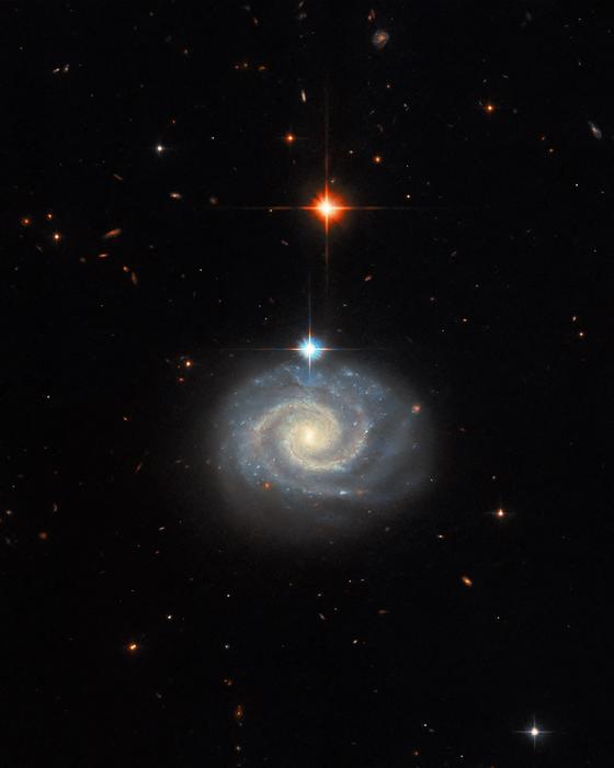 This whirling image features a bright spiral galaxy known as MCG-01-24-014, which is located about 275 million light-years from Earth. In addition to being a well-defined spiral galaxy, MCG-01-24-014 has an extremely energetic core known as an active galactic nucleus (AGN) and is categorized as a Type-2 Seyfert galaxy. Seyfert galaxies, along with quasars, host one of the most common subclasses of AGN. While the precise categorization of AGNs is nuanced, Seyfert galaxies tend to be relatively nearby and their central AGN does not outshine its host, while quasars are very distant AGNs with incredible luminosities that outshine their host galaxies.