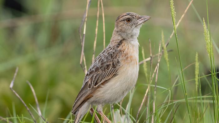 THE PLAINS LARK CORYPHA KABALII IS ONE OF THE LEAST-KNOWN LARK SPECIES IN THE WORLD. IT OCCURS MAINLY IN EASTERN ANGOLA AND NEIGHBORING PARTS OF THE DEMOCRATIC REPUBLIC OF THE CONGO AND ZAMBIA. IT IS GENETICALLY WELL SEPARATED FROM ITS CLOSEST RELATIVES AND ALSO HAS A UNIQUE FLIGHT DISPLAY. MINYANYA PLAIN, NORTH-WESTERN ZAMBIA, 2 NOVEMBER 2023.