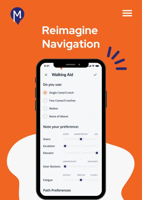 (IMAGE SHOWS A SMARTPHONE SCREEN WITH AN APP INDICATING A USER SELECTED A SINGLE CANE/CRUTCH AND PREFERENCE FOR USING AN ELEVATOR. BEHIND THE PHONE SCREEN IS AN ORANGE BACKGROUND AND, IN WHITE, THE WORDS "REIMAGINE NAVIGATION.")