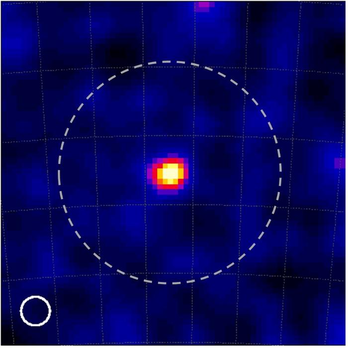 The image of the Vela pulsar. The image has a resolution more than 40 times better than what could be achieved previously: The circle at the bottom left indicates the pulsar’s image spread for comparison with the image spread of the previously best gamma ray image (of a different stellar object), indicated by the dashed circle.