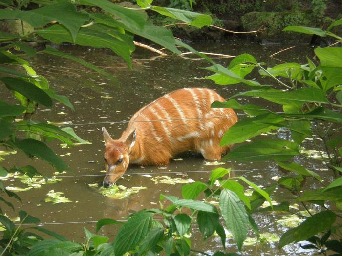 In the water here is the Sitatunga. It's an antelope, which lives in several African countries. The sitatunga lives in swamp-areas and was once found in greater numbers.