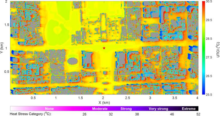 HORIZONTAL DISTRIBUTION OF UNIVERSAL THERMAL CLIMATE INDEX IN ℃ AT 2-METER-OFF GROUND AT 10 A.M. JULY 1ST 2021, HIGHER VALUE INDICATES MORE HEAT STRESS.