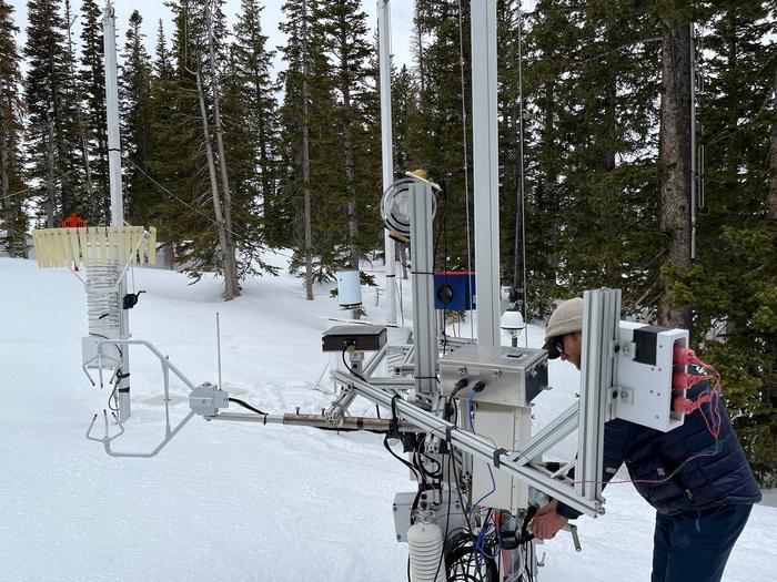 GRADUATE STUDENT RYAN SZCZERBINSKI EXAMINES INSTRUMENTATION CALLED A DIFFERENTIAL EMISSIVITY IMAGING DISDROMETER, OR DEID, DEVELOPED BY UNIVERSITY OF UTAH RESEARCHERS AND INSTALLED AT ALTA NEAR THE TOP OF LITTLE COTTONWOOD CANYON. THE EQUIPMENT MEASURES THE HYDROMETEOR MASS, SIZE AND DENSITY OF SNOWFLAKES.