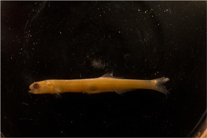 A NORTHERN ANCHOVY LARVA (25 MM LONG) COLLECTED DURING BIOLOGICAL SURVEYS AND PRESERVED IN FORMALIN.